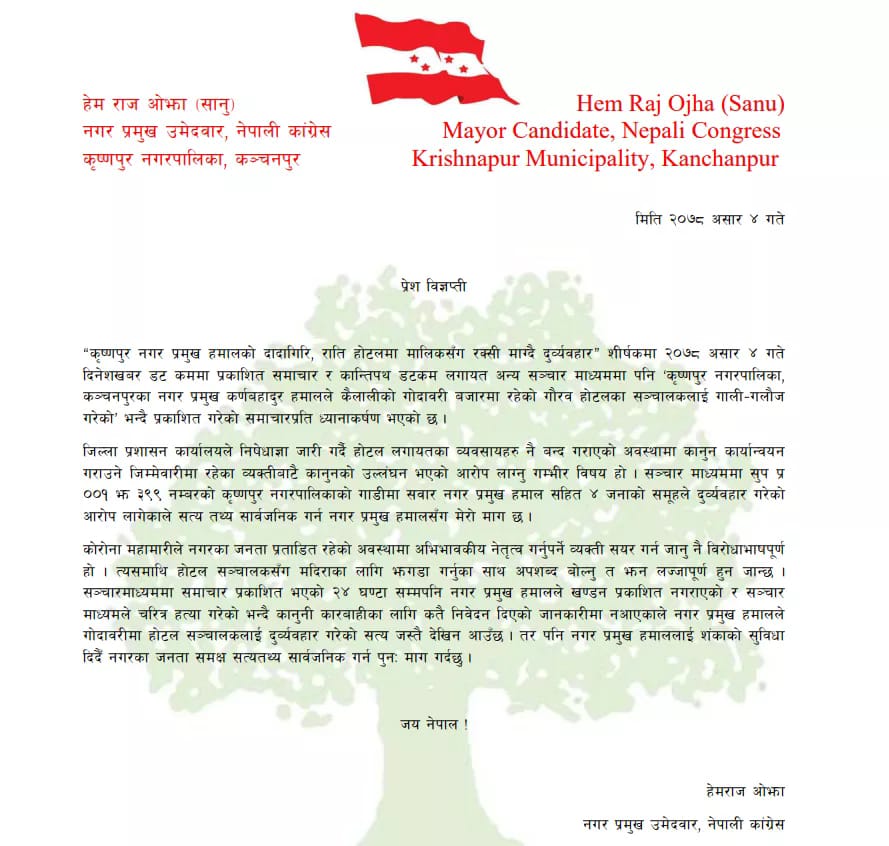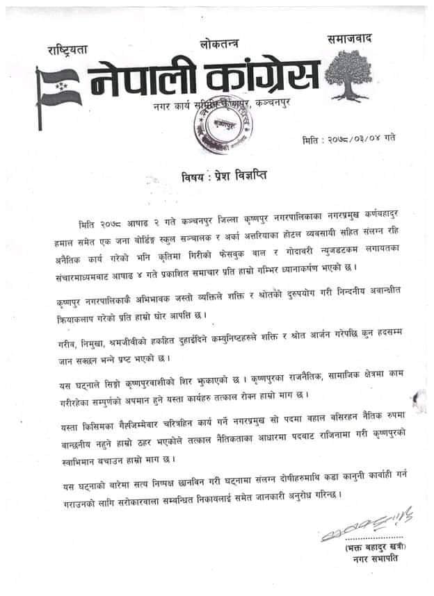 कञ्चनपुर: कञ्चनपुरको कृष्णपुर नगरपालिकाका मेयर कर्ण हमालले होटल सञ्चालकमाथि गरेको दुव्र्यवहारको घटताप्रति नेपाली कांग्रेस नगर समितिले आपत्ती जनाएको छ।