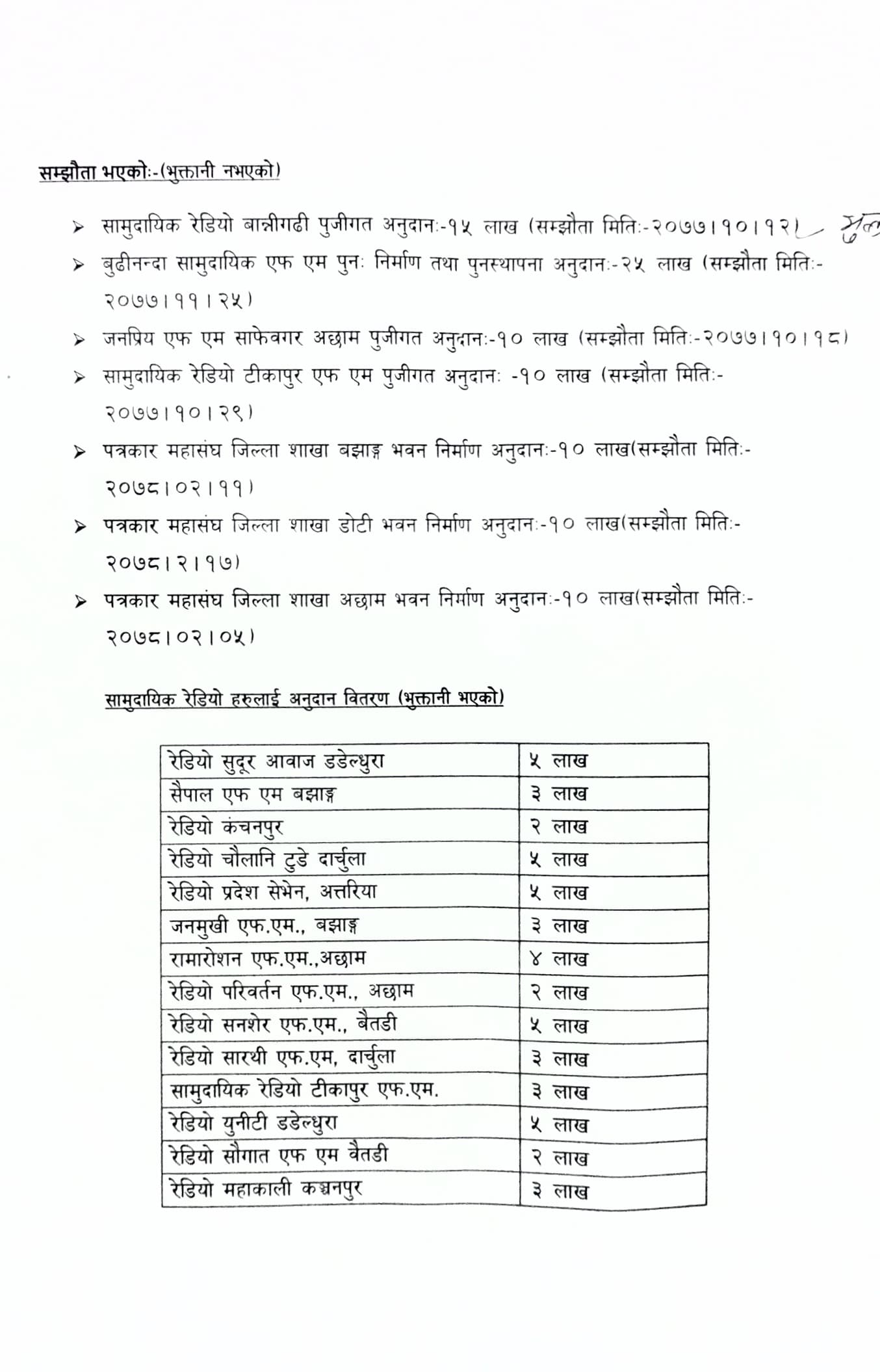 रेडियो सुदूर आवाज डडेल्धुरालाई ५ लाख, सैपाल एफएम बझाङलाई ३ लाख, रेडियो कञ्चनपुरलाई २ लाख, रेडियो चौलानी टुडे दार्चुलालाई ५ लाख, रेडियो प्रदेश सेभेन, अत्तरियालाई ५ लाख, जनमुखी एफएम बझाङलाई ३ लाख, रामारोशन एफएम, अछामलाई ४ लाख, रेडियो परिवर्तन एफएम अछामलाई २ लाख, रेडियो सनशेर एफ.एम बैतडीलाई ५ लाख, रेडियो सारथी एफएम, दार्चुलालाई ३ लाख, सामुदायिक रेडियो टीकापुर एफएमलाई ३ लाख, रेडियो युनिटी डडेल्धुरालाई ५ लाख, रेडियो सौगात एफएम बैतडीलाई २ लाख र रेडियो महाकाली कञ्चनपुरलाई ३ लाख अनुदान रकम भुक्तानी दिइएको हो। रेडियोहरुको समेत बिल–भ्रपाई बुझाएका छैनन्।