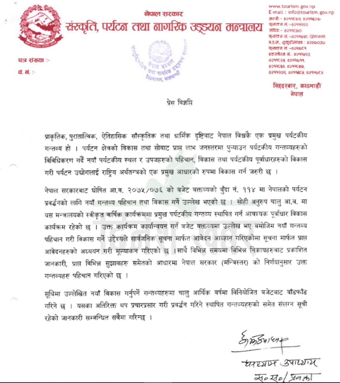 संस्कृति, पर्यटन तथा नागरिक उड्डयन मन्त्रालयले पर्यटन बोर्ड, स्थानीय र प्रदेश सरकारबाट सिफारिस भएको र आवेदन परेको गन्तव्यको आधारमा नयाँ गन्तव्य छनोट गरेको जनाएको छ। सरकारले बजेटमार्फत नै नयाँ सय गन्तव्य छनोटका लागि ५० करोड रुपैयाँ विनियोजन गरेको थियो।