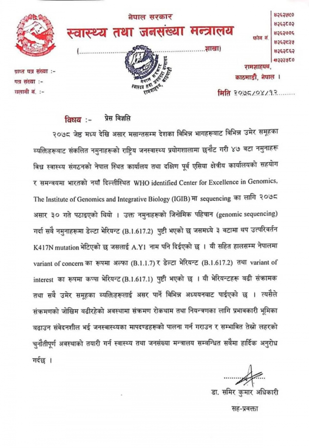 स्वास्थ्य तथा जनसंख्या मन्त्रालयले मंगलबार विज्ञप्ति जारी गर्दै ४७ वटा नमुनाहरुको जिनेमिक पहिचान गर्दा सबै डेल्टा भेरियन्ट (बी.१.६१७.२) पुष्टि भएको र जसमध्ये ३ वटामा थप (के.४.१.७.एन) म्युटेसन भेटिएको छ।