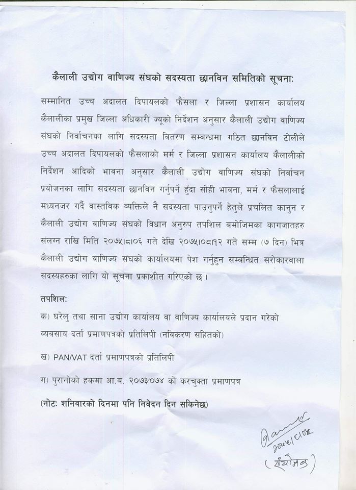 उच्च अदालत दिपायलले निर्वाचन रोक्न दिएको अन्तरिम आदेशका कारण स्थगित भएको निर्वाचन प्रक्रिया सदस्यता छानविनपछि सुरु गरिने भएको छ । उच्च अदालतले वास्तविक व्यवसायी मात्रैलाई मताधिकार दिने गरी निर्वाचन सम्पन्न गराउन आदेश दिएपछि प्रशासनले त्यसको छानविन गर्न समिती बनाएकोमा सो समितीले छानविनका लागि काम थालेको हो । व्यवसायीहरुले कागजपत्र बुझाएपछि समितिले छानवीन गर्ने र त्यसका आवश्यक थप जनशक्तीहरुको व्यवस्थापनका विषयमा समेत तयारी भईसकेको प्रशासनले जनाएको छ । व्यवसायीले वास्तविक व्यवसायी भएको कागजात पेस गरेपछि त्यसकोृजति सक्दो चाँडो छानविन गरेर मंसीरभित्रै निर्वाचन सम्पन्न गराउने तयारी गरिरहेको कैलालीका सहायक प्रमुख जिल्ला अधिकारी भट्टले बताए ।