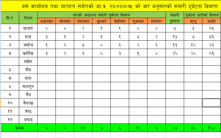 सबैभन्दा बढी कार्तिकमा मंगलबार र शुक्रबार गरेर १२, भदौँ र असोजमा ६/६ तथा साउनमा दुईवटा सवारी दुर्घटनामा परेको प्रहरीको तथ्याङ्क छ। यस्तै चालु वर्षको चार महिनामा आइतबार सात, सोमबार पाँच, बुधबार सात, बीहिबार छ र शनिबार तीन गरेर जम्मा ५४ सवारी दुर्घटनामा परेको प्रहरीले जनाएको छ।