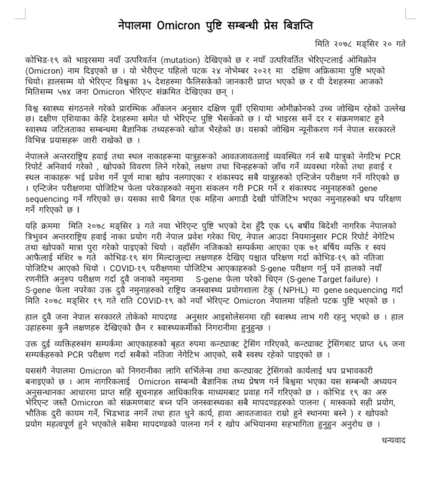 धनगढीः नेपालमा पहिलो पटक कोभिड–१९ को नयाँ भेरियन्ट ओमिक्रोन पुष्टि हुनेमा दक्षिण अफ्रिकाबाट नेपाल आएका ६६ वर्षीय विदेशी नागरिक र उनको सम्पर्कमा आएका  ७१ वर्षीय अर्का विदेशी व्यक्ति छन्। उनीहरू दुवैले कोरोनाविरुद्धको खोपको पूर्ण मात्रा लगाएका र पीसीआर रिपोर्ट पनि नेगेटिभसहित नेपाल प्रवेश गरेका मन्त्रालयले जनाएको छ।