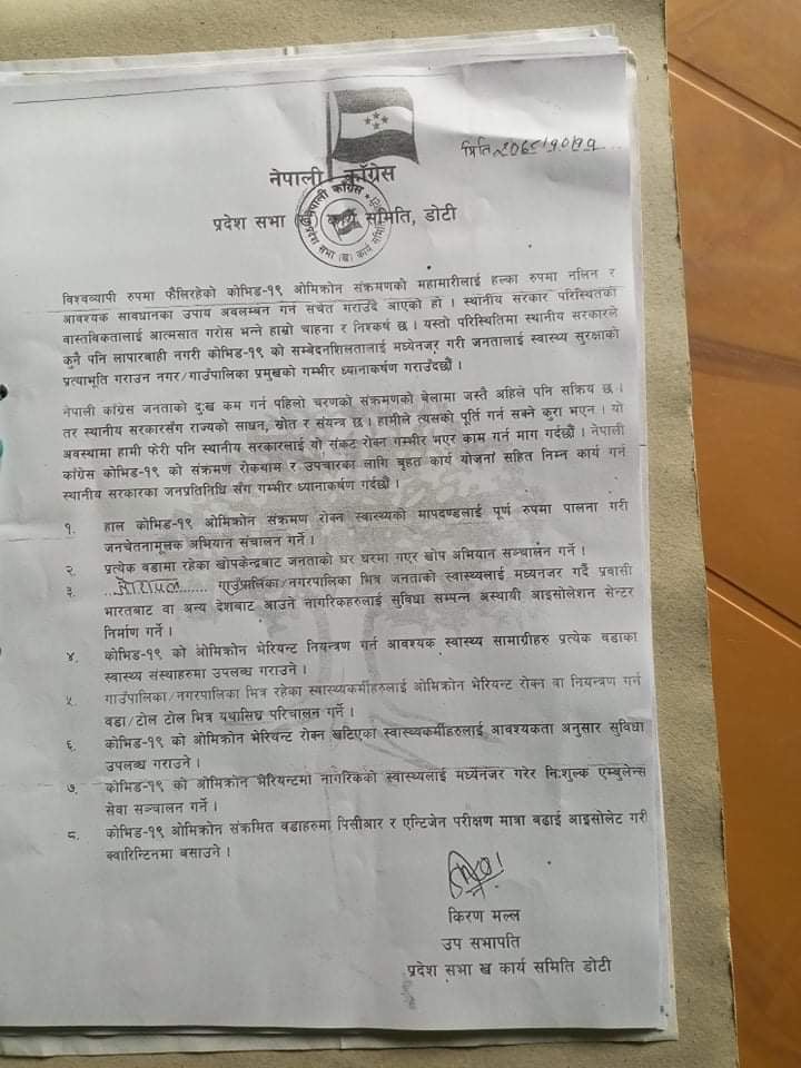 डोटी: डोटीको जोरायल गाउँपालिकामा कोरोनाको ओमिक्रोन भेरियन्ट भित्रिन नदिन माग गर्दै ज्ञापनपत्र बुझाइएको छ। नेपाली कांग्रेस प्रदेश सभा (ख) कार्यसमितिले कोरोनाको नयाँ भेरियन्टको संक्रमण फैलिन नदिन माग गर्दै मंगलबार गाउँपालिकालाई ज्ञापनपत्र बुझाएको हो।