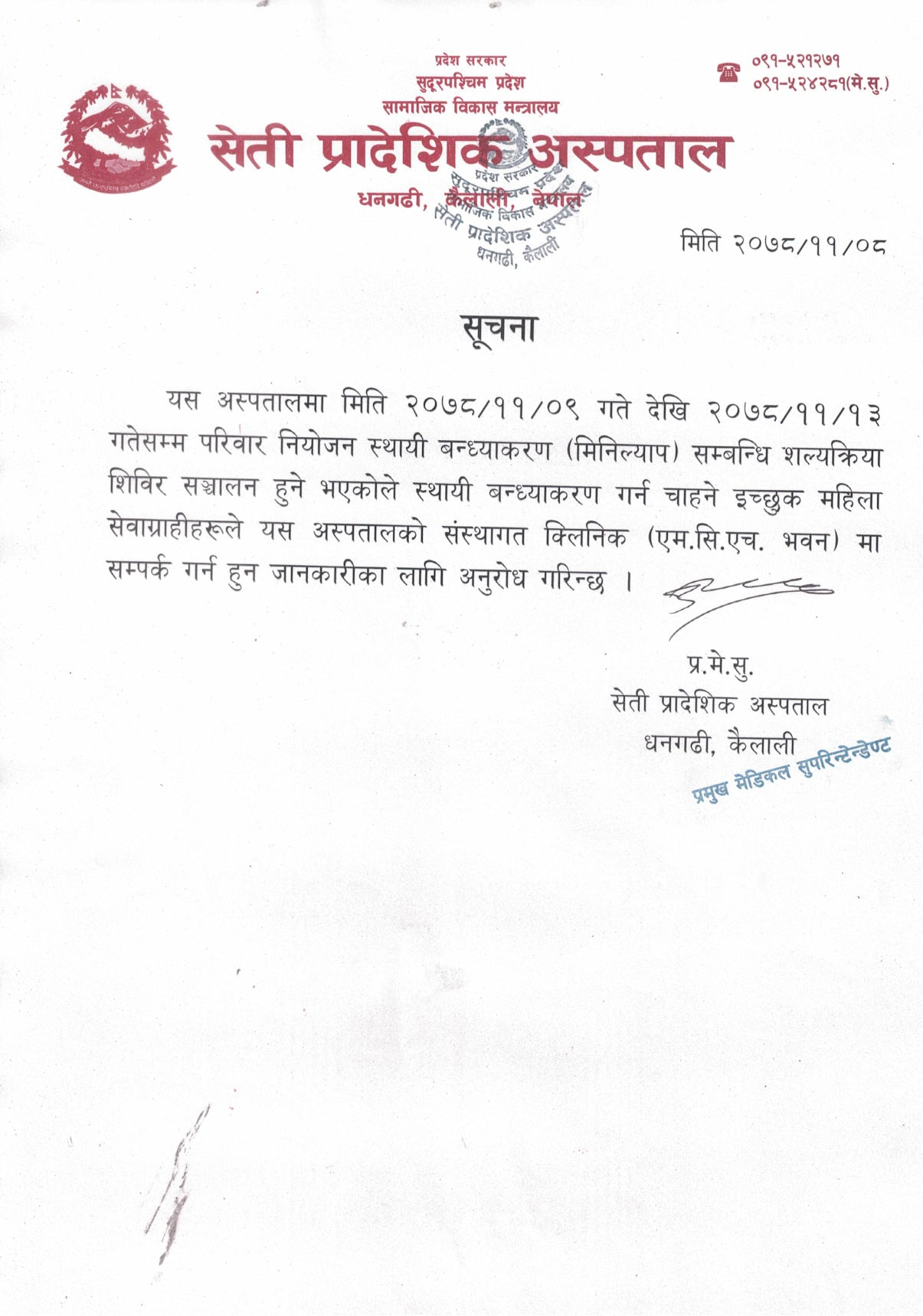 बन्ध्याकरण गराउन इच्छुक महिलाले अस्पतालको संस्थागत क्लिनिक(एससिएच भवन) मा सम्पर्क गर्न आग्रह गरिएको छ।