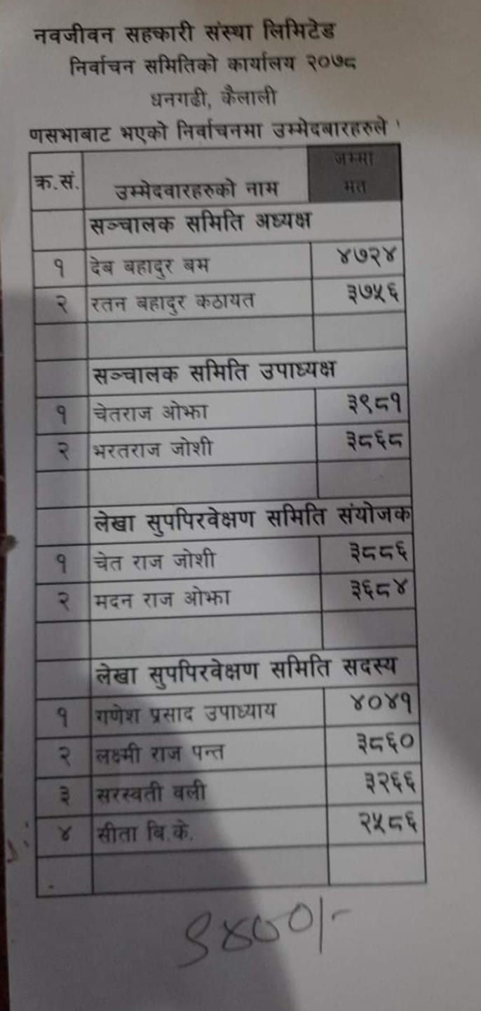 निर्वाचन समितिका अनुसार नवजीवन सहकारी संस्थामा २९ हजार ५ सय ७७ शेयर सदस्य रहेकोमा १७ हजार ८० मत खसेको थियो। सहकारीको नेतृत्वको लागि कठायत र बमको नेतृत्वमा दुई प्यान चुनावी मैदानमा उत्रिएका थिए। कठायतको प्यानलबाट चेतराज ओझा उपाध्यक्ष पदमा र उत्तमराज जोशी, रोम स्वाँर, केशवराज मिश्र, गणेश बम, गोपाल चौधरी, कृष्णबहादुर चौधरी, जयराज जोशी, पूर्ण जोशी, उपेन्द्र बिष्ट, भीमबहादुर बलायर र राधिकाकुमारी चौधरी सदस्य पदमा उम्मेदवार छन्।