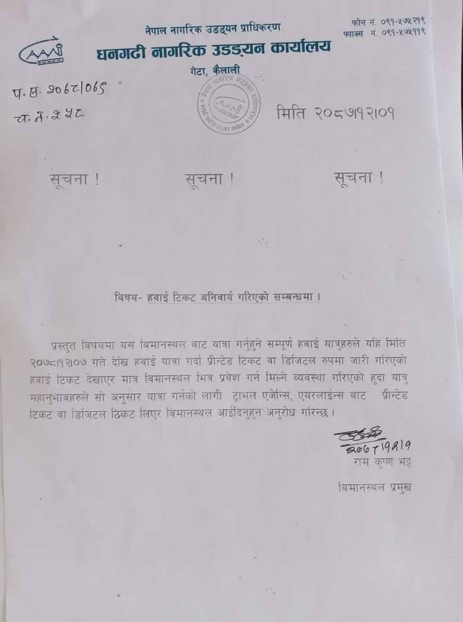 अब धनगढी विमानस्थल प्रवेश गर्न प्रिन्टेड वा डिजिटल टिकट देखाउनै पर्ने
