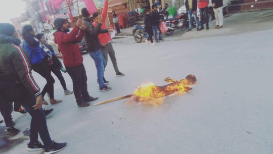 सरकारविरुद्ध आन्दोलनरत प्रमुख प्रतिपक्ष दल नेपाली कांग्रेसमा आवद्ध नेपाल विद्यार्थी संघ (नेविसंघ) ले प्रधानमन्त्री केपी शर्मा ओलीको पुत्ला दहन गरेको छ।