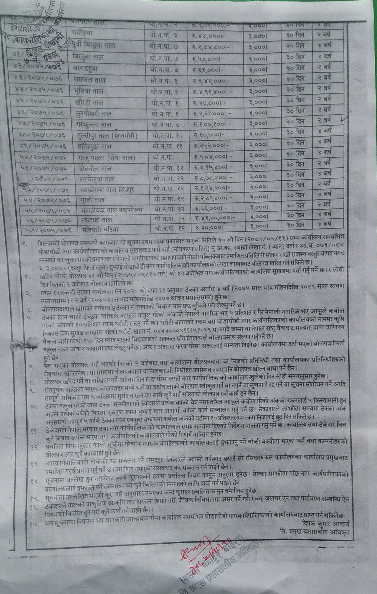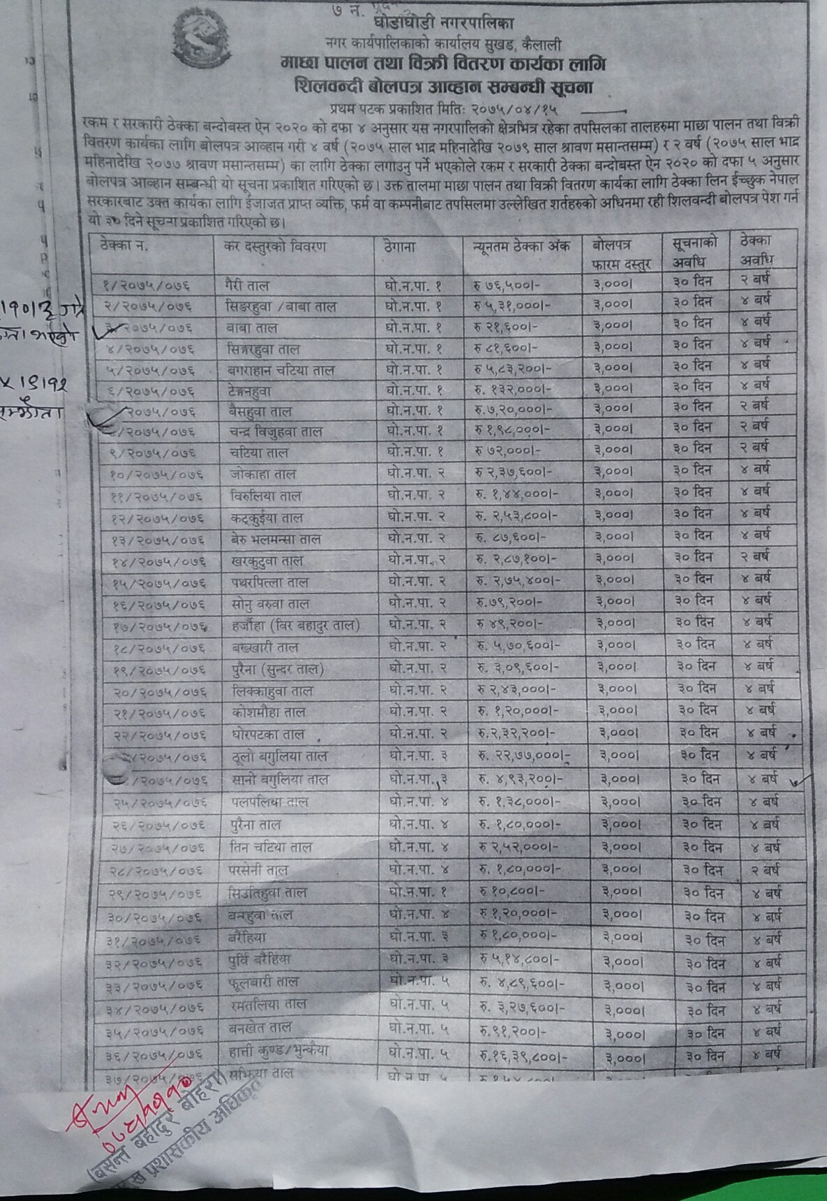 कैलालीको घोडाघोडी नगरपालिकाले नगर क्षेत्रमा रहेका ५७ वटा ताललाई माछा पालनका लागि भन्दै ठेक्कामा दिने तयारी थालेको पाईएको छ। घोडाघोडी नगरपालिकाले सूचना जारी गर्दै नगर क्षेत्रका तालहरु माछा पालन प्रयोजनका लागि भन्दै ठेक्कामा लगाउने तयारी गरिरहेको हो। नगरपालिकाले सामुदायिक वन र घोडाघोडी सिमसार क्षेत्रमा पर्ने तालहरुमा समेत ठेक्काको सूचीमा राखेको छ।
