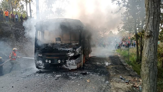 कर्णाली: कालीकोटबाट काठमाडौँका लागि छुटेको छुटेको ना८ख २३५६ नंको यात्रुवाहक बसमा आगलागी हुँदा पूर्ण रुपले नष्ट भएको छ । बस आज बिहान ७ः३० बजे कालीकोटको जिते बजारबाट छुटेको थियो। कालीकोटदेखि सुर्खेत–नेपालगन्ज हुँदै काठमाडौँका लागि जाँदै गरेका बस गुडिरहेको अवस्थमा बराहताल गाउँपालिका–८ सुर्खेत ओदाल तालस्थित दिउँसा ३ः४५ बजे आगलागी भएको जिल्ला प्रहरी कार्यालय सुर्खेतका सूचना अधिकारी एवं प्रहरी नायब उपरीक्षक रामप्रसाद घर्तीले जानकारी दिए।