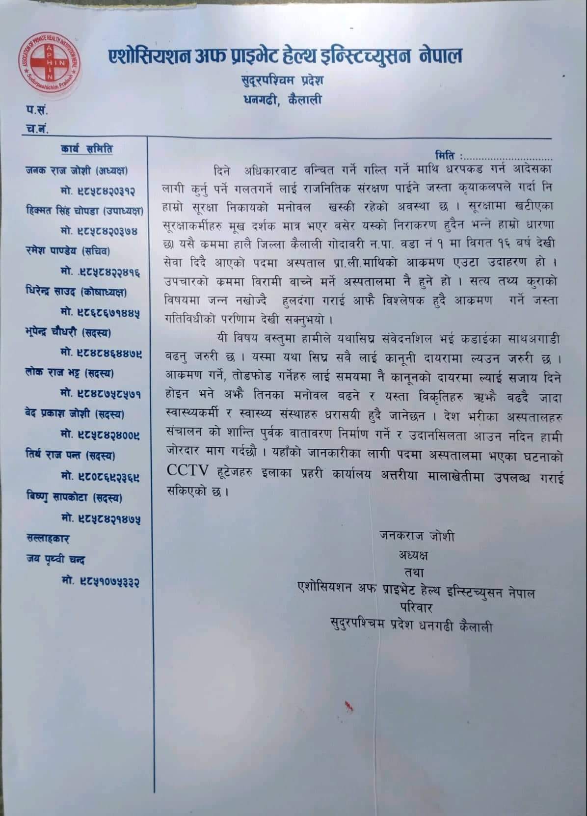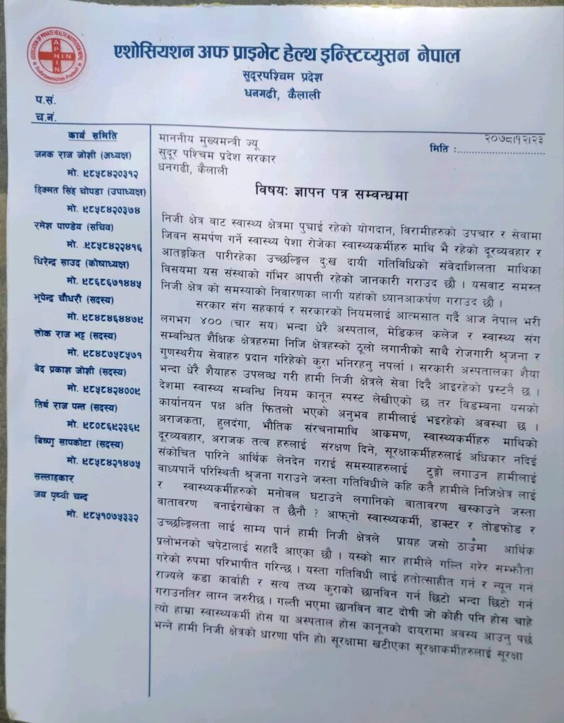 धनगढी: कैलालीको अत्तरियास्थित पद्मा अस्पतालमा तोडफोड भएको घटनाप्रति एशोसियशन अफ प्राइभेट हेल्थ इन्स्टिच्युसनले ध्यानाकर्षण गराएको छ। तोडफोडको घटनामा संलग्नलाई कारर्बाहीको माग राख्दै एशोसियशनले सुदूरपश्चिमका मुख्यमन्त्री त्रिलोचन भट्टलाई ज्ञापनपत्र बुझाइएको हो।