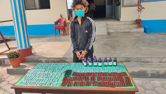 प्रहरीले उनको घरबाट ट्रामा १०४० ट्याबलेट, नाइट्रोभेट ५२५ ट्याब्लेट र मोरेक्स १० बोतल बरामद गरेको छ।
