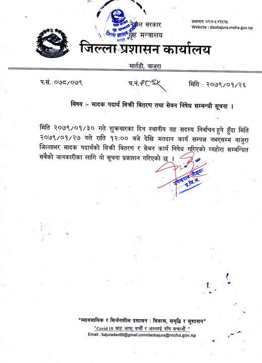 मतदान कार्य सम्पन्न नभएसम्म जिल्लाभर मादक पदार्थ विक्री वितरण र सेवन गर्न निषेध गरिएको सूचनामा उल्लेख छ। वैशाख ३० गते स्थानीय तह निर्वाचन हुँदैछ। निर्वाचन भयरहित र शान्तिपूर्ण रुपमा सम्पन्न गर्नका लागि मदिरा विक्री वितरणमा रोक लगाइएको जनाइएको छ।