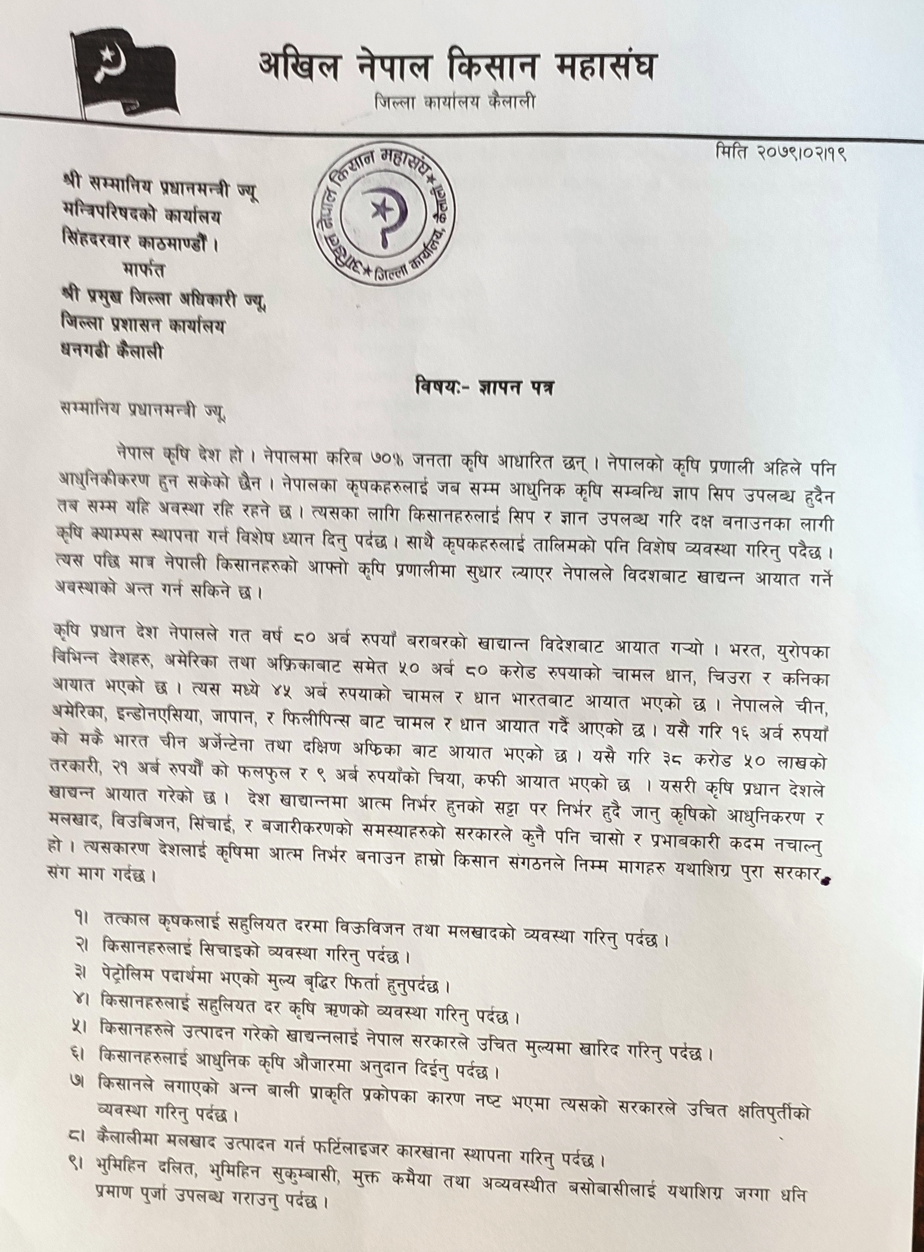 मल उपलब्ध गराउन माग गर्दै किसान महासंघ कैलालीद्वारा प्रधानमन्त्रीलाई ज्ञापन पत्र