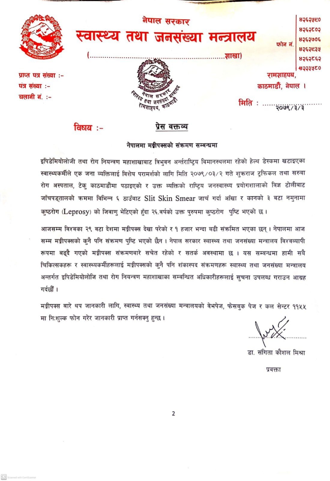 स्वास्थ्य तथा जनसंख्या मन्त्रालयका अनुसार बिहीबार उक्त व्यक्तिलाई शुक्रराज ट्रफिकल तथा सरूवा रोग अस्पताल टेकुमा स्वास्थ्य परीक्षणका लागि लगिएको थियो। उक्त व्यक्तिको स्वास्थ्य परीक्षण गर्दा कुष्ठरोगको जिवाणु भेटिएको शुक्रराज ट्रफिकलकी प्रवक्ता डाक्टर संगिता कौशल मिश्राले विज्ञप्ति मार्फत बताएकी छन्।