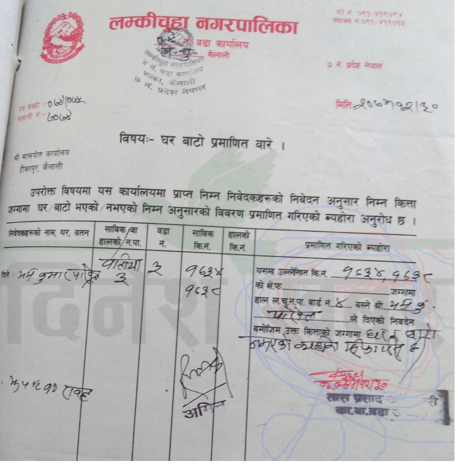 १५ वर्षदेखि चलनचल्ती र दुई वर्ष अघि ग्रावेल गरिएको कुरा थाहा हुदाहुदै नक्सामा बाटो कायम नभएको देखाउदै लम्की चुहा नगरपालिकाका जनप्रतिनिधिको सिफारिसमा कम मूल्य तिर्दै जग्गा खरिद गरिएको हो। सिफारिसमा कार्यवहाक वडा अध्यक्ष ताराप्रसाद अधिकारी र लम्की चुहा नगरपालिकाका तत्कालीन अमिन रामकृष्ण शाहीको हस्ताक्षर छ। रावलले खरिद गरेको जग्गामा बाटो हुदाँ हुदै गलत सिफारिस किन गरिएको भन्ने जिज्ञासामा लम्की चुहा नगरपालिका ४ का सदस्य अधिकारीले आफू लेखपढ गर्न नआउने हुदा  कागजपत्रमा के लेखिएको थियो भन्ने विषयमा थाहा नभएको प्रतिक्रिया दिए। अमिन शाहीले नक्सामा घरबाटो कायम नभएकाले सिफारिस गरिएको तर बाटो कायम भएको बारेमा जानकारी भएको प्रतिक्रिया दिए।