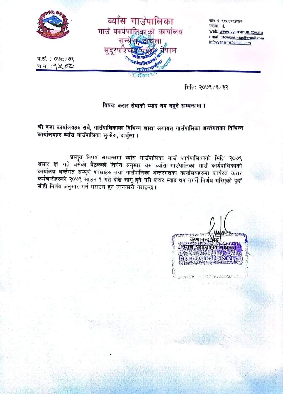 धनगढीः दार्चुलाको व्याँस गाउँपालिकाले करार कर्मचारीको अवधि नथप्न आदेश दिएको छ। गाउँपालिकाले शनिवार एक सूचना जारी गर्दै पालिका अन्तरगतका सम्पूर्ण शाखा तथा कार्यालयलाई उक्त आदेश दिएको हो।