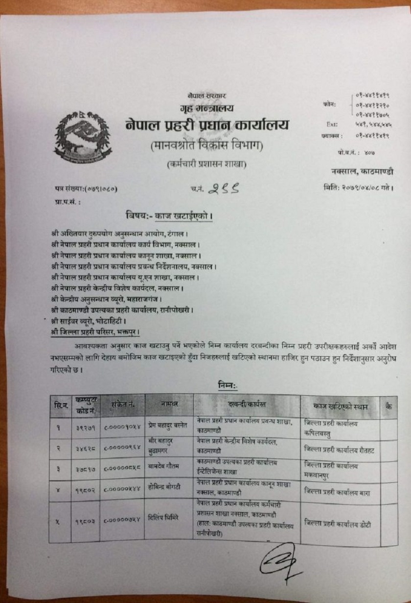 जसअनुसार ७ जिल्लाका प्रहरी प्रमुख परिवर्तन भएका छन्। जिल्ला प्रहरी कार्यालय डोटीमा दिलिप घिमिरेलाई सरुवा गरिएको छ। कपिलवस्तुमा प्रेमबहादुर बस्नेतलाई सरुवा गरिएको छ। रौतहटमा वीरबहादुर बुढामगर, मकवानपुरमा वामदेव गौतम र बारामा होबिन्द्र बोगटीलाई सरुवा गरिएको छ।