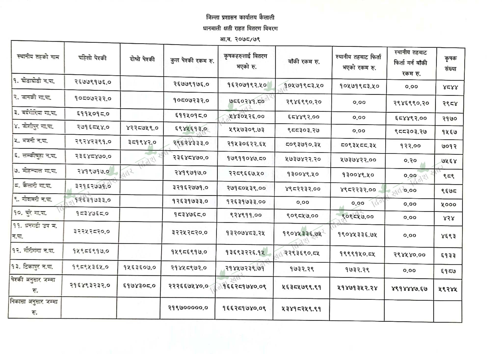 जिल्लाका ५९ हजार २ सय ४५ किसानका लागि वितरण गर्न संघीय सरकारले पठाएको राहत रकम वितरण गर्न जिल्लाका स्थानीय तह असफल भएका छन्। अझै स्थानीय तहले पेश्की लिएको ४९ लाख १४ हजार चार सय ४७ रुपैयाँ फिर्ता आउन बाँकी रहेको जिल्ला प्रशासन कार्यालय कैलालीले जनाएको छ। स्थानीय तहले १६ करोड ६२ लाख ८१ हजार सात सय ४० रुयैयाँ मात्र वितरण गरेका छन्।