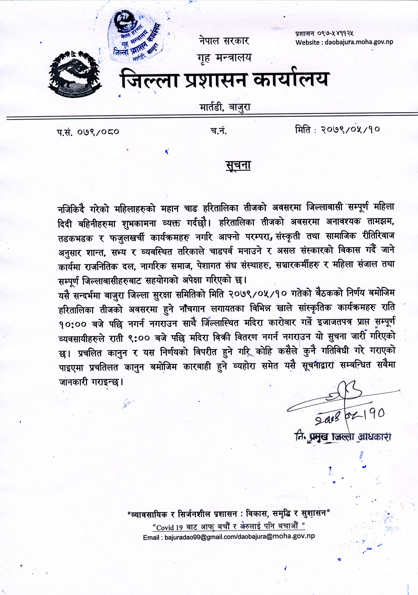 धनगढी: बाजुरामा राति १० बजेपछि नाचगान गर्न नपाइने भएको छ। जिल्ला प्रशासन कार्यालय बाजुराले सूचना जारी गर्दै तीजका अवसरमा हुने नाचगान लगायतका विभिन्न साँस्कृतिक कार्यक्रमहरु राति १० बजेपछि नगर्न भनिएको छ।