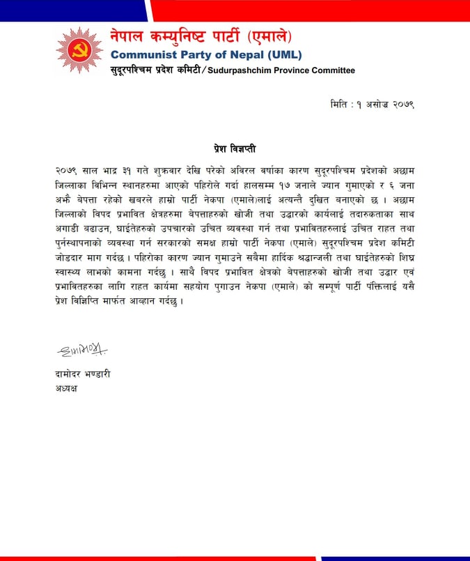 प्रदेश अध्यक्ष दामोदर भण्डारीद्वारा जारी विज्ञप्तिमा घाइतेहरुको उपचार, बेपत्ताहरुको खोजी र उद्धारमा चासो दिन सरकारसँग माग गरिएको हो। विज्ञप्तिमा पार्टी पंक्तिलाई बेपत्ताहरुको खोजी, उद्धार एवम् प्रभावितहरुको लागि राहत उपलब्ध गराउन समेत निर्देशन जारी गरिएको छ।
