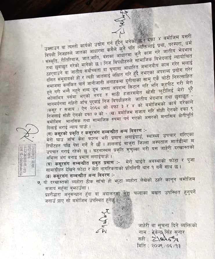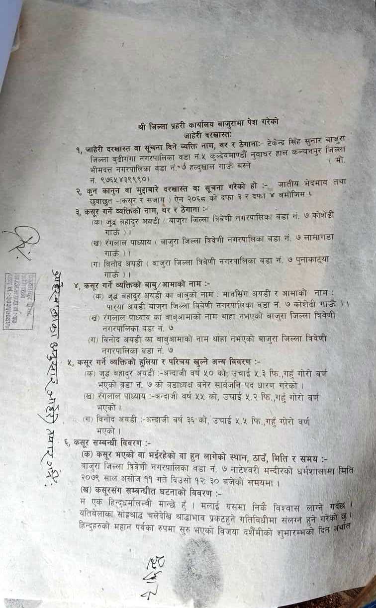 त्रिवेणि नगरपालिका वडा नम्बर ७ का वडा अध्यक्ष जुद्धबहादुर अयडीसहित ३ जनाविरुद्ध बिहीवार जिल्ला प्रहरी कार्यालय बाजुरामा जातीय भेदभाव तथा छुवाछुतसम्बन्धी मुद्दा दर्ता भएको जिल्ला प्रहरी कार्यालय बाजुराका प्रमुख, प्रहरी नायव उपरीक्षक (डीएसपी) सूर्य थापाले जानकारी दिए।