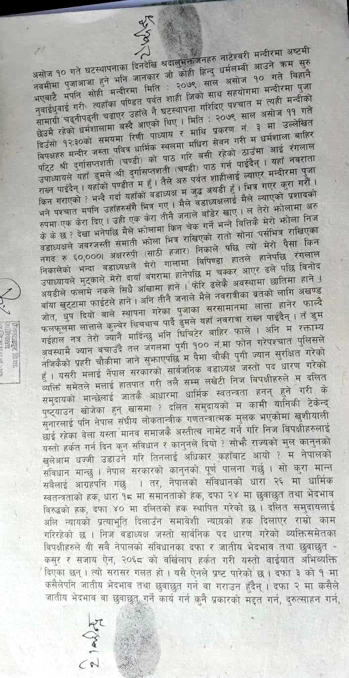 धनगढीः बाजुराको एक मन्दिरमा दलित प्रवेश गरेको भन्दै कुटपिट गरेको आरोपमा वडाध्यक्षसहित ३ जनाविरुद्ध मुद्दा दर्ता भएको छ। त्रिवेणी नगरपालिका वडा नम्बर ७ मा रहेको नाटेश्वरी मन्दिरमा प्रवेश गरी पूजापाठ गरेको भन्दै टेकेन्द्रसिंह सुनारलाई कुटपिट गर्ने वडाध्यक्षसहित ३ जनाविरुद्ध जिल्ला प्रहरी कार्यालय बाजुरामा मुद्धा दर्ता भएको हो। वडाध्यक्ष अयडी अयडी नेपाली काँग्रेस निर्वाचित भएका हुन्।
