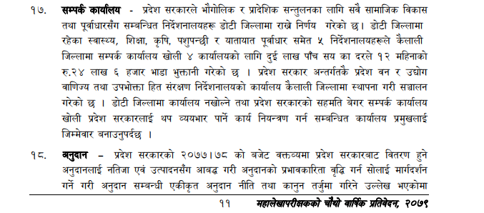 एक निर्देशनालयले सम्पर्क कार्यालय सञ्चालन गरेर दुई लाख पाँच सयका दरले १२ महिनाको २४ लाख ६ हजार भाडामा खर्च गरेका हुन्। प्रदेश सरकारको सहमती बिना खोलिएका कार्यालयहरुले आर्थिक भार बढेको प्रतिवेदनमा भनिएको छ।