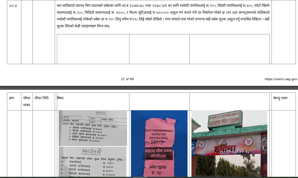 Dhangadhi: The Dasharath Bhim Udyan (Park) in Dhangadhi has reportedly been charging visitors an entry fee that exceeds the rate set by the Municipal Assembly. According to the City Council of Dhangadhi sub-metropolitan city, the provincial fee for entry to the park is 10 rupees for locals, 40 rupees for foreign nationals, and 20 rupees for photography cameras, while video cameras and films cost 400 rupees and 500 rupees respectively.