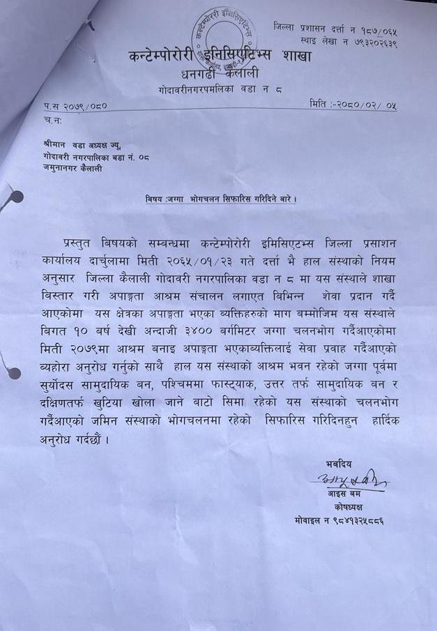 सामुदायिक वनकी अध्यक्ष सिँहले भनिन्, ‘आपाङ्गको घर छ। वृद्ध आश्रमका लागि पनि घर बनेको छ। हामीलाई पत्र पठाएको थियो। तर हामीले पास गरेनौ। वनको जग्गा दिन सकिदैन। हामीलाइ सालको बोट रोप्न भनेको थियो। त्यही ठाउँमा घर बनेका छन। हामीले संस्थाहरु हटाउन सकेनौ। संस्थाहरुले दर्ता गरिपाँउ भनेर वडा र नगरमा दिएका छन्।’