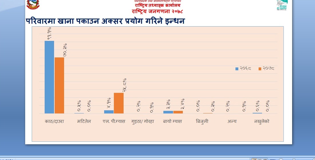 According to the 2068 BS census, approximately 91 percent of households were cooking meals using wood fires. However, the latest national census conducted in 2078 BS reveals that only 70.30 percent of families continue to utilize this traditional cooking method. Notably, the census data indicates zero usage of kerosene for cooking in the Far West.