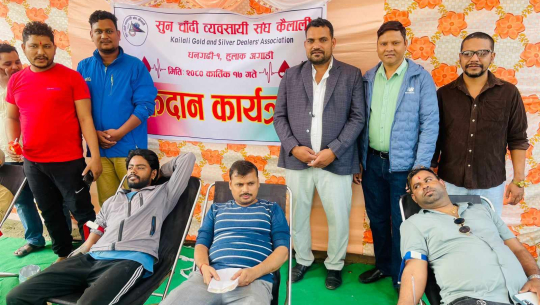 सुनचाँदी व्यवसायी संघ कैलालीको आयोजनामा आज (शुक्रबार) रक्तदान कार्यक्रमको आयोजना गरिएको हो। धनगढीमा आयोजना गरिएको रक्तदान कार्यक्रममा ६३ जनाले रक्तदान गरेको सुनचाँदी व्यवसायी संघ कैलालीका अध्यक्ष यदु सुनारले बताए।