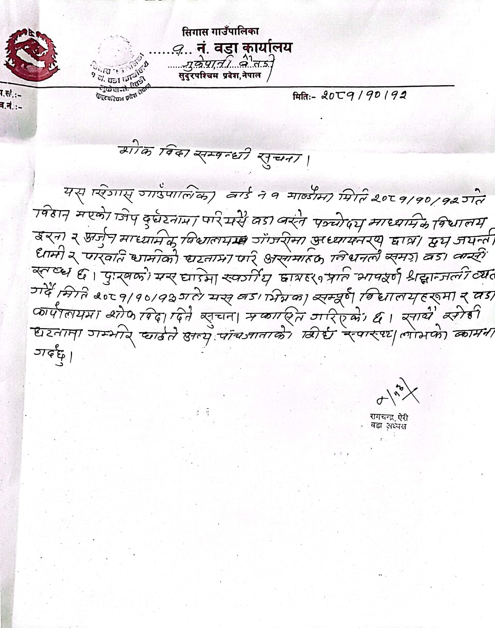 According to a notice signed by Ward Chair Ramchandra Airi, the decision was made to honor the victims of the accident that occurred on Saturday in Sigas Rural Municipality-1, which claimed the lives of two residents and left four others injured.