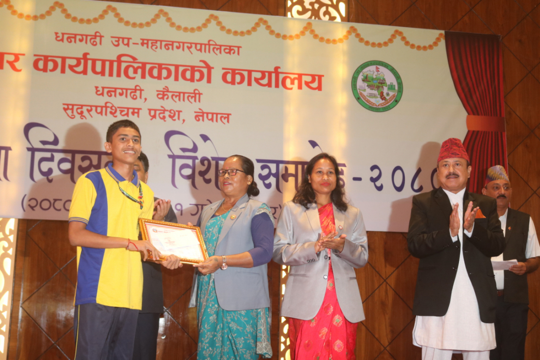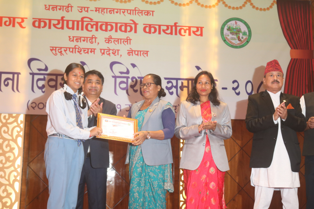 धनगढीको एरिष्टो स्कुलका प्रधानाध्यापक शान्ती अधिकारी सम्मान ग्रहण गर्दै।