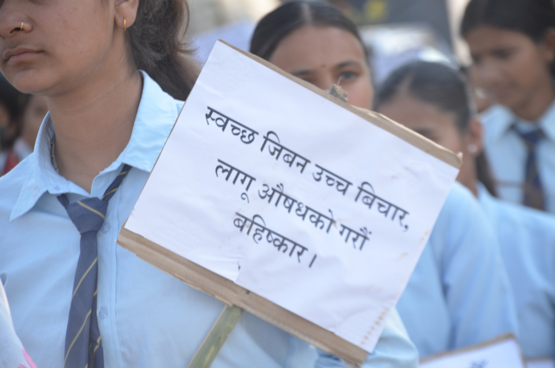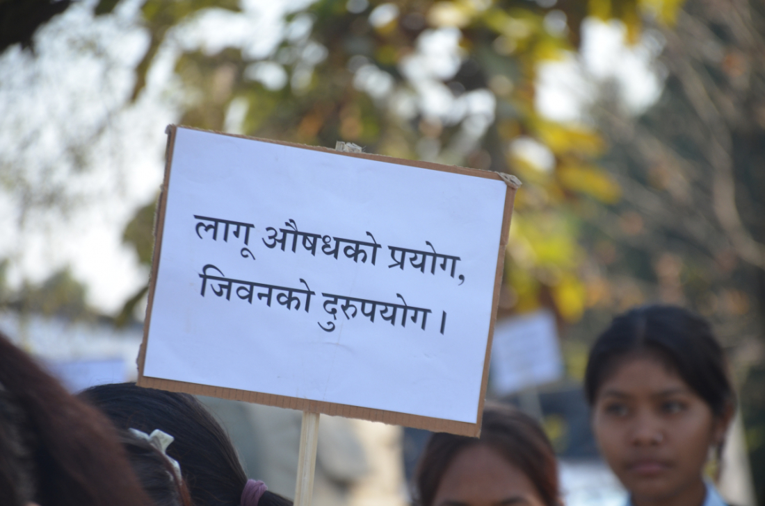 उनीहरूले ‘लागु औषधको प्रयोग, जीवनको दुरुपयोग’ लगाएतका नाराहरू लेखिएका कार्ड बोकेका हुन्।