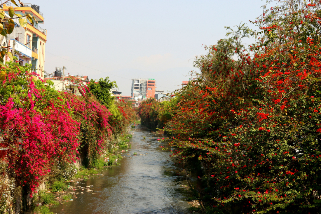 काठमाडौँको रातोपुल आसपास धोविखोला करिडोरमा वसन्त ऋतुमा फुलेका रङ्गीचङ्गी फूल