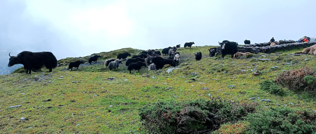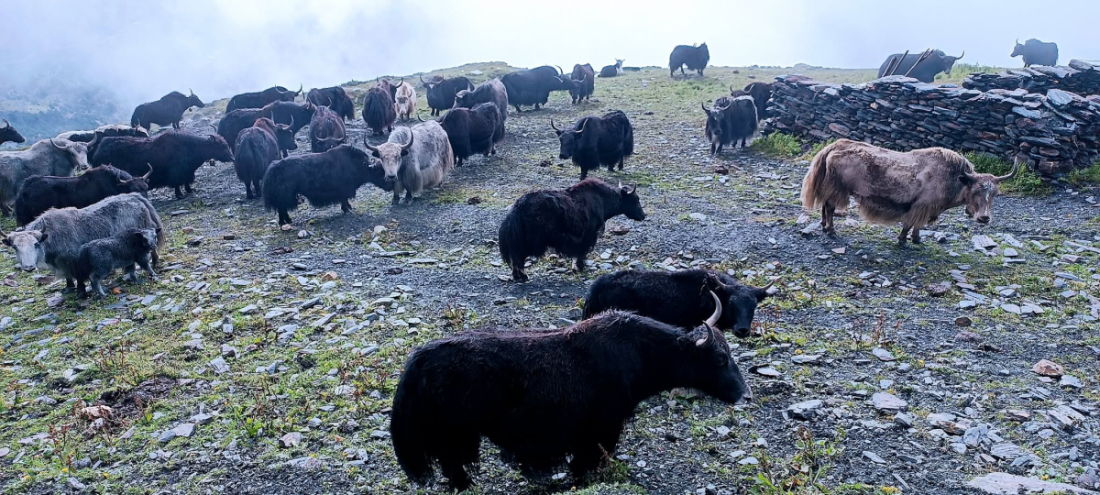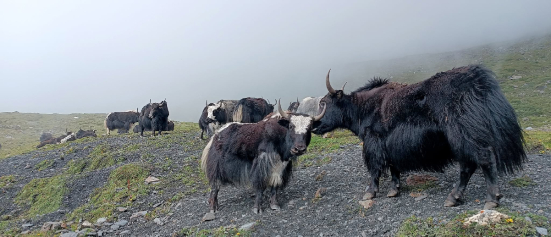 उच्च हिमाली लेक आलुबारीमा याक, नाक र चौँरीगाई
