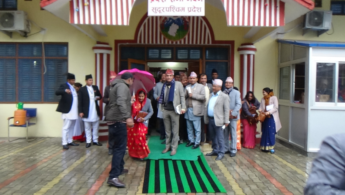 शुक्रबार बसेको प्रदेशसभा बैठक सकिने बितिकै पानी परेपछि सुदूरपश्चिम प्रदेशका मन्त्री र प्रदेशसभा सदस्यहरु प्रदेशसभा भवन अगाडी ओत लागेका हुन्।