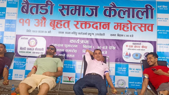 बैतडी समाज कैलालीको आयोजनामा सञ्चालन गरिएको कार्यक्रममा १० जना महिलासहित ११८ जनाले रक्तदान गरेको संयोजक राजबहादुर चन्दले बताए।