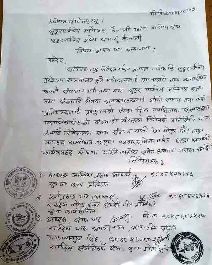 पाँच वटा कला, संस्कृति संघमा आबद्ध कलाकारहरूले संस्थागत रूपमै सुदूरपश्चिम महोत्सवमा स्थानीय कला, संस्कृतिले उचित मौका नपाएको भन्दै आधिकारिक ज्ञापनपत्र बुझाएर माग सम्बोधन नभए महोत्सवको विरोध गर्ने जनाएका छन्। ज्ञापनपत्र बुझाउँदा छुटेका थप संघ, संस्थाले पनि उद्योग वाणिज्य संघको रबैया ठिक नभएको बताएका छन्। स्थानीय कलाकारलाई बेवास्ता गरिएको आरोप कलाकारहरूले लगाए पनि कैलाली उद्योग वाणिज्य संघले भने स्थानीय कला र संस्कृतिलाई स्थान कसरी दिन सकिन्छ भनेर वरिष्ठ डेउडा गायक नरेन्द्रराज रेग्मीलाई जिम्मेवारी दिइएको जनाएको छ।