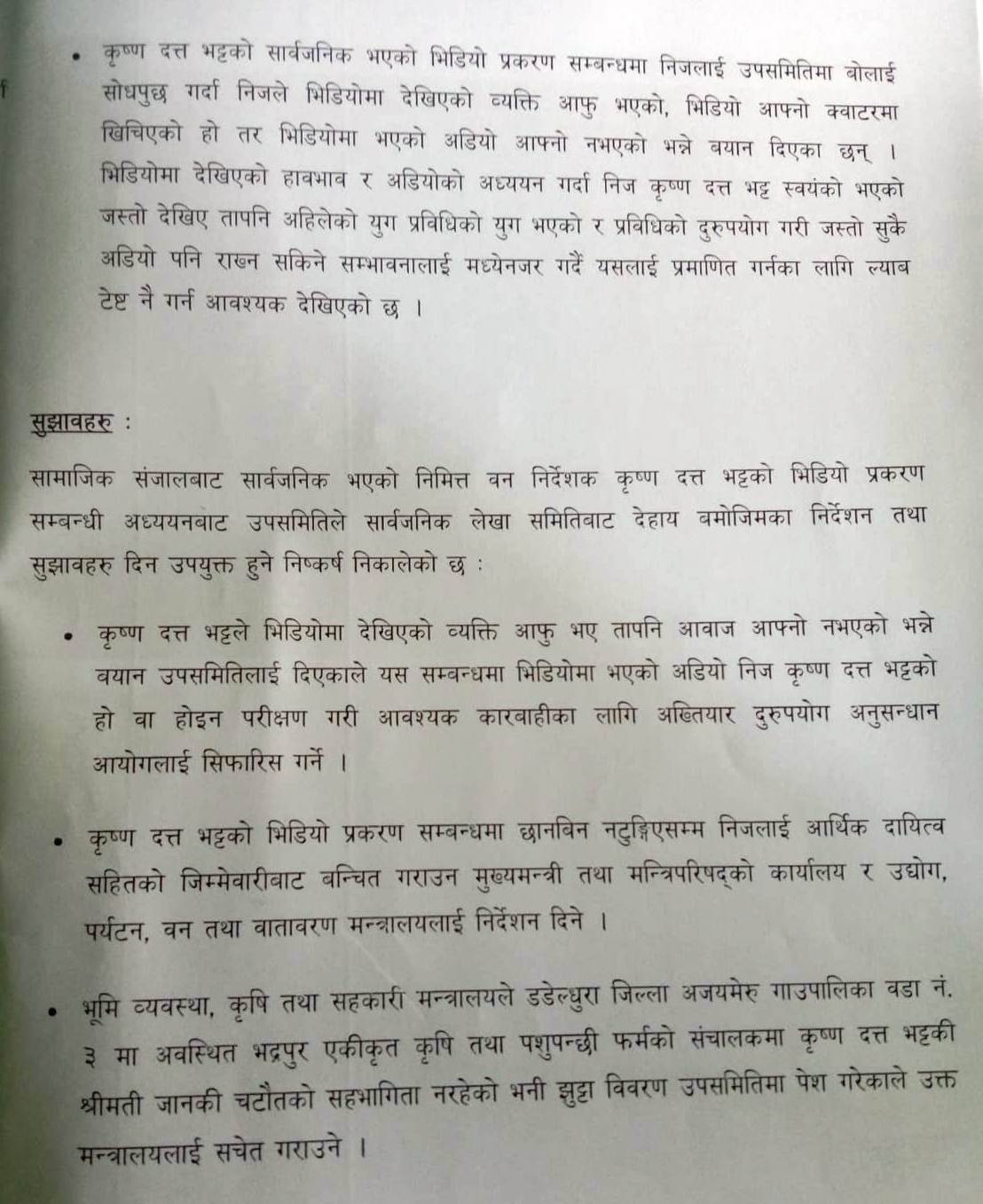 सुदूरपश्चिमको उद्योग, पर्यटन वन तथा वातावरण मन्त्री लक्ष्मण किशोर चौधरीलाई पत्राचार गरिएको छ। समितिले भिडिओमा रहेको अडियोको प्रयोगशाला परीक्षण गर्ने र कृष्णदत्त भट्टको घुस काण्डको अख्तियारलाई छानबिनका लागि सिफारिस गर्ने निर्णयसमेत गरिएको छ।