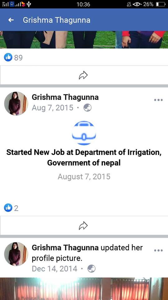 चार वर्ष अगाडी मात्र सरकारी सेवामा प्रवेश गरेकी ग्रिस्मा ठगुन्ना तत्कालीन एमालेबाट निर्वाचित दार्चुलाका प्रतिनिधीसभा सदस्य गणेश ठगुन्नाकी भतिजी नाता पर्छिन्। महेन्द्रनगरमा बसोबास गर्दै आएकी इन्जिनीयर ठगुन्ना जलस्रोत तथा सिचाई डिभिजन कार्यालयको सूचना अधिकारी समेत हुन्। प्रदेश सरकारको झण्डै २५ लाखको लागतमा कञ्चनपुरको भीमदत्त नगरपालिका १९ मा चौधर नदी नियन्त्रण तटबन्धनको योजनामा गत जेठ २२ गतेबाट सुरु भएको थियो, उनको घुस रकमको बार्गेनिङ।
