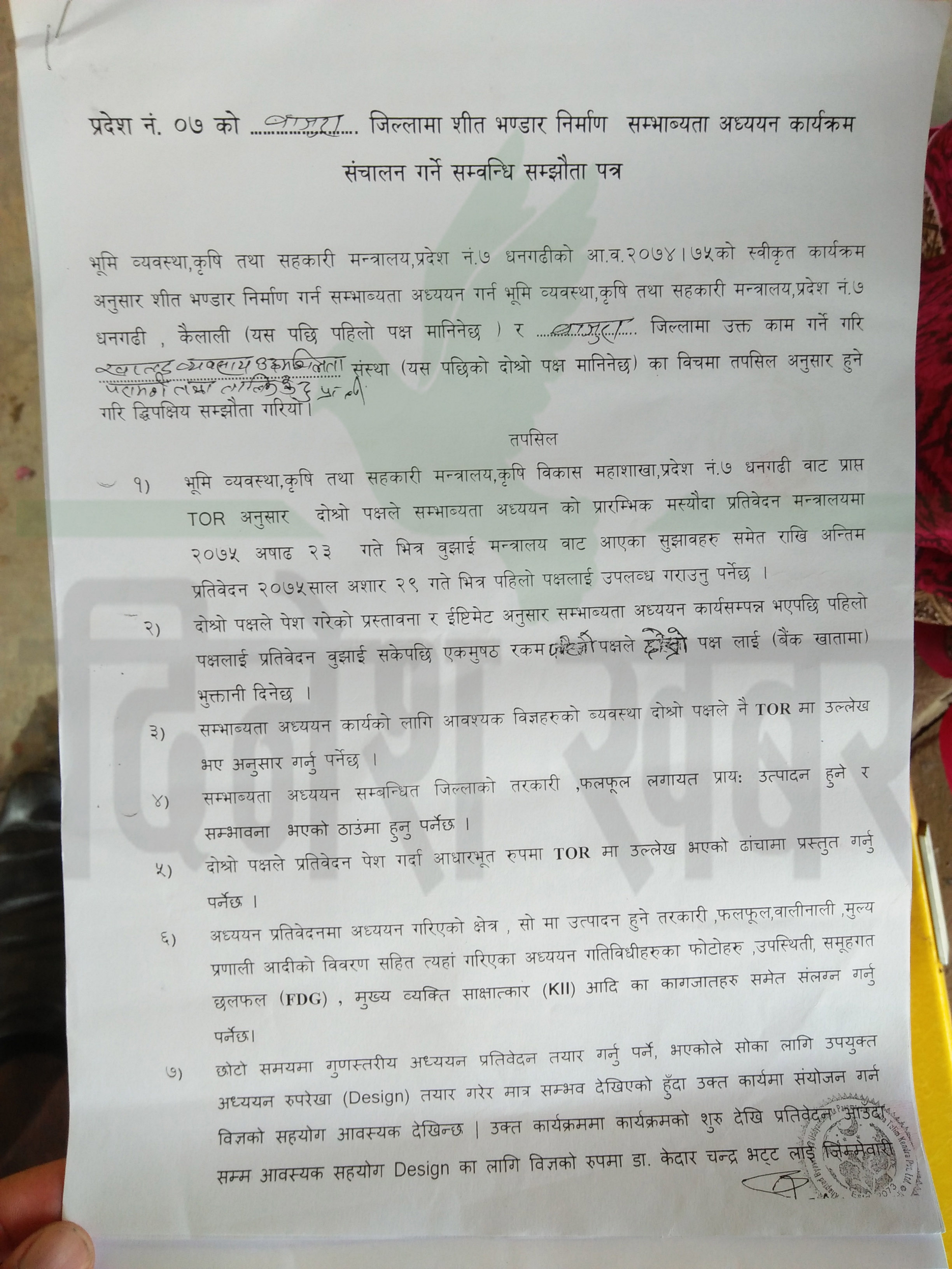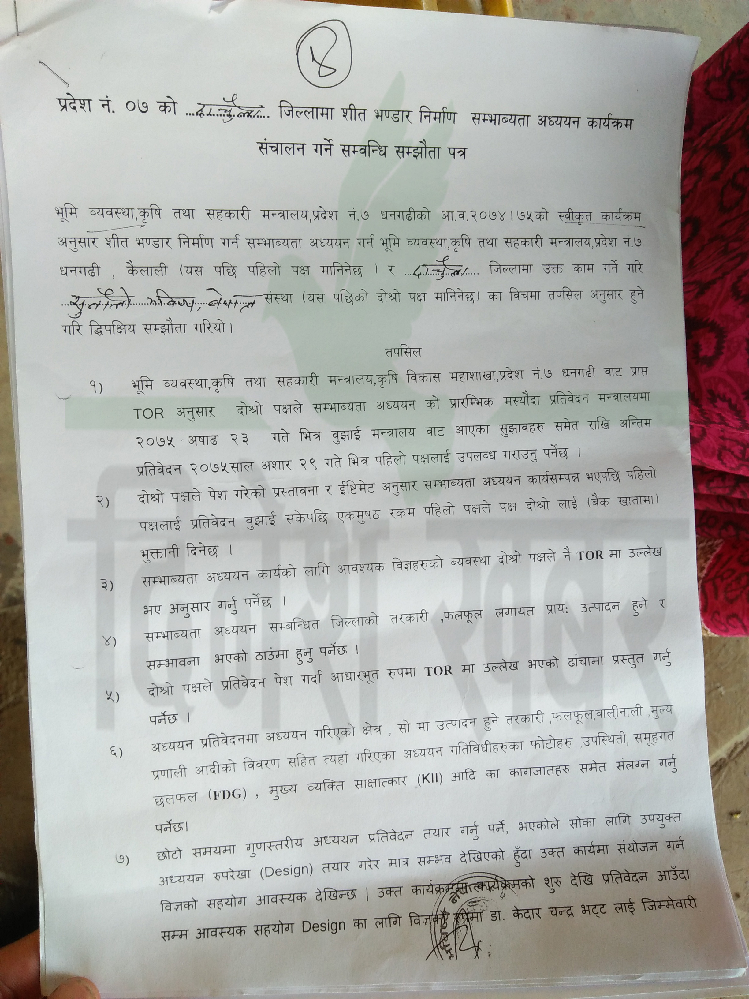 प्रदेश सरकारको आर्थिक वर्ष २०७४-७५ को अल्पकालीन बजेटमा शित भण्डार केन्द्रको सम्भाव्यता अध्ययनका लागि गरेको सम्झौताको नमुना देखाउदै मन्त्रालयको आधिकारिक छाप समेत नभेटिएको बताईन्। उनले दार्चुला र बाजुरा जिल्लामा शित भण्डारको सम्भाव्यता अध्ययन गर्न गरिएको सम्झौता पत्रमा कन्सल्टेन्सीको आधिकारिक छाप, हस्ताक्षर भएपनि मन्त्रालयको नभेटिएको भन्दै सभामा नमुना नै देखाएकी थिईन्।