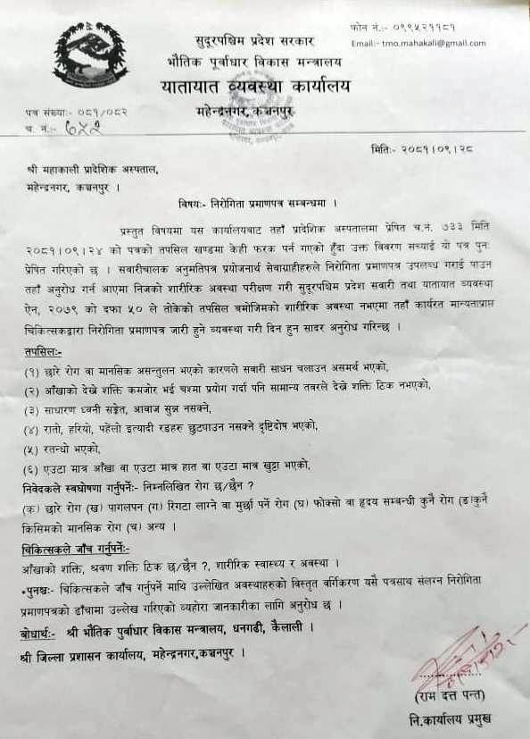 यातायात व्यवस्था कार्यालय, महेन्द्रनगर उक्त विषयमा जानकार छ। तर, २ वर्षदेखि २ सय रुपैयाँमा परीक्षण बिना नै निरोगिताको प्रमाणपत्र पेस हुँदा पनि कुनै कारबाही तथा सम्बन्धित निकायहरूमा जानकारी गराइएको छैन। महाकाली प्रादेशिक अस्पताललाई स्वास्थ्य परीक्षण गरेर निरोगिताको प्रमाणपत्र बनाउन भन्दै निवेदन दिएको यातायात कार्यालय मूकदर्शक बनेको हो। यातायात व्यवस्था कार्यालय, महेन्द्रनगरका निमित्त प्रमुख रामदत्त पन्तले उक्त विषयमा जानकार रहेको बताएका छन्। कार्यालय परिसरका पसलहरूबाट छ्यापछ्याप्ती स्वास्थ्य परीक्षण बिना नै निरोगिताका प्रमाणपत्रहरू बिक्री हुँदै आएका उनले बताए। उनले भने, ‘पसलहरूमा निरोगिताको प्रमाणपत्रहरू पाउने गरेको छ। हामीले महाकाली अस्पतालसँग माग गरेका छौ।’