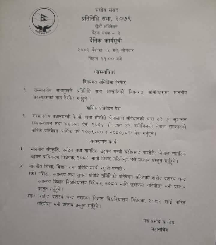 प्रतिनिधि सभाको सोमवार बिहान ११ बजेबाट सुरु भएको बैठकको कार्यसूचीको ४ नम्बरमा शिक्षा, विज्ञान तथा प्रविधि मन्त्री रघुजी पन्तले ‘शिक्षा, स्वास्थ्य तथा सूचना प्रविधि समितिको प्रतिवेदनसहितको सहिद दशरथ चन्द स्वास्थ्य विज्ञान विश्वविद्यालय विधेयक, २०८० माथि छलफल गरियोस’ भनी प्रस्ताव प्रस्तुत गर्ने र ‘सहिद दशरथ चन्द स्वास्थ्य विज्ञान विश्व विद्यालय विधेयक, २०८१ लाई पारित गरियोस’ भनी प्रस्ताव प्रस्तुत गर्ने कार्यसूची रहेको थियो। प्रतिनिधि सभाको बैठक शिक्षकहरुको आन्दोलन केन्द्रीत भएपछि विश्वविद्यालयको विधेयक प्रतिनिधि सभामा पेस नभएको हो। तर, प्रतिनिधि सभाको सोमवारको बैठकले संस्कृति पर्यटन तथा नागरिक उड्डयन मन्त्री बद्रीप्रसाद पाण्डेले नेपाल नागरिक उड्डयन प्राधिकरण विधेयक, २०८१ माथि विचार गरियोस भन्ने प्रस्ताव प्रस्तुत गरेकामा पारित भएको छ। सहित दशरथ चन्द स्वास्थ्य विज्ञान विश्वविद्यालयको विधेयक मङ्गलवार बिहान ११ बजेको प्रतिनिधि सभाको बैठकमा प्रस्तुत हुने दाबी गरिएको छ।