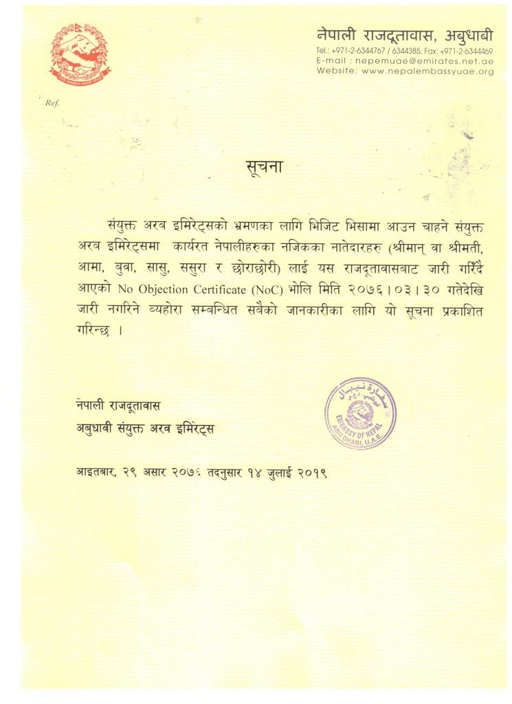 युएई स्थित नेपाली दूतावासले जारी गर्दै आएको नो अब्जेक्सन सर्टिफिकेट (एनओसी) जारी नगर्ने निर्णय गरेको छ। आइतबार एक सुचना जारी गर्दै दूतावासले सोमबारदेखि एनओसी जारी नगर्ने निर्णय गरेको दूतावासकी द्धितीय सचिव तथा सूचना अधिकारी विष्णुकुमारी अधिकारीले जानकारी दिइन्। युएई भ्रमणमा भिजिट भिसामा जान चाहनेहरुका लागि त्यहाँ कार्यरत नेपाली कामदारका आफन्तले दूतावासमार्फत एनओसी जारी गर्दै आएका थिए। युएईमा रहेकाहरुले नजिकका नातेदार श्रीमान, श्रीमती, आमाबुबा सासु, ससुरा र छोराछोरीलाई ल्याउँदा दूतावासले उक्त पत्र जारी गर्ने गरेको थियो।