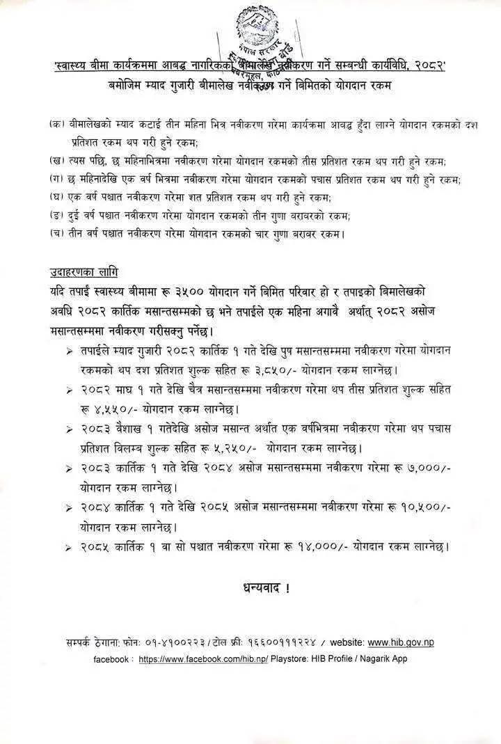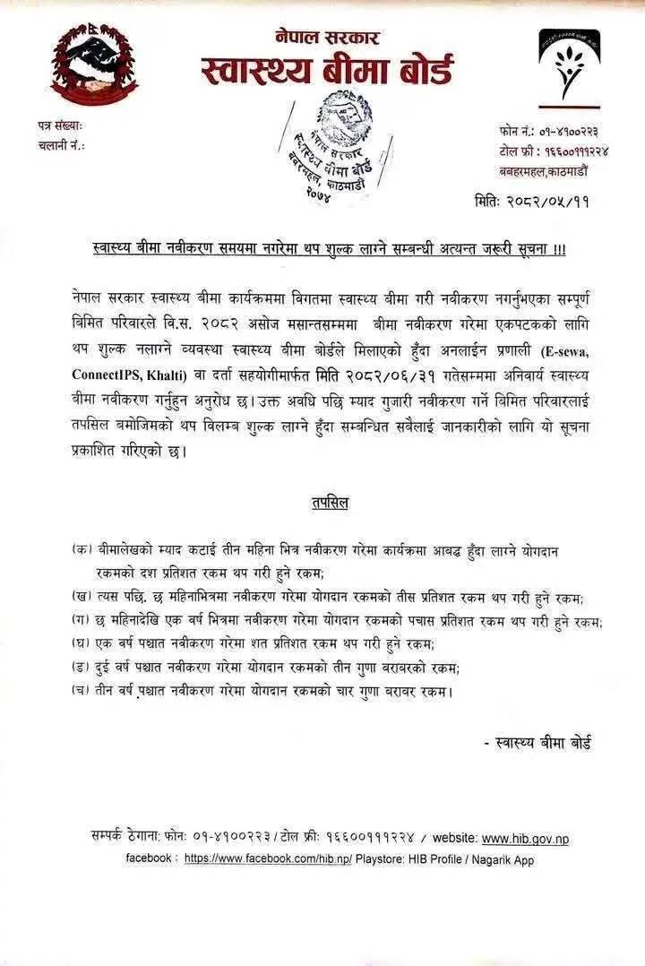 काठमाडौंः स्वास्थ्य बीमा बोर्डले बीमा समयमै नवीकरण नगर्ने परिवारलाई अतिरिक्त शुल्क तिर्नुपर्ने व्यवस्था लागू गरेको छ।