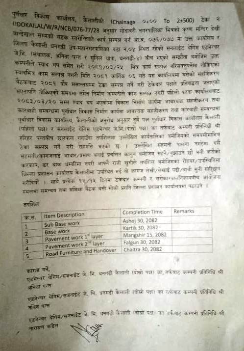 धनगढी : कैलालीका प्रमुख जिल्ला अधिकारी कृष्णप्रसाद लम्साल, गोदावरी नगरपालिकाका नगर प्रमुख वीरेन्द्र भट्ट, वडाध्यक्षहरू, पूर्वाधार कार्यालय, कैलालीका इन्जिनियर जनक रोकाया लगायतको सहभागितामा थेगिम–सनलाइट जेभी र तेडी निर्माण सेवासँग सडक निर्माणको काम सुरु गर्ने कागज बनाइयो। एड्भेन्चर–थेगिम–सनलाइट जेभीको तर्फबाट अनिता पन्त, नविन पन्त र नारायण कडेलले कागजमा हस्ताक्षर गरेका छन्।