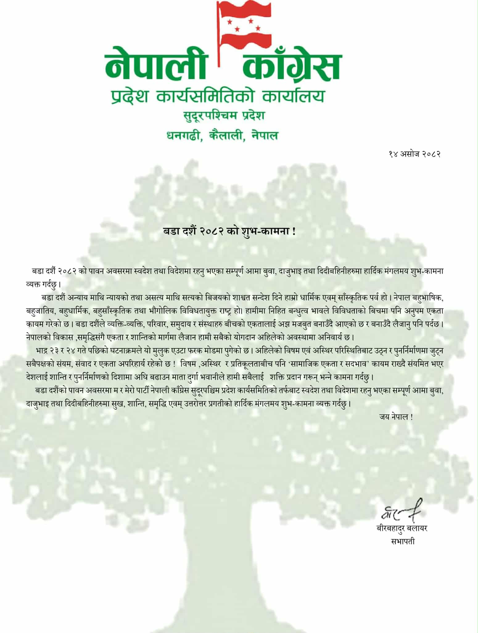 प्रदेश सभापति बलायरले आफ्नो ब्यक्तिगत र पार्टीको सुदूरपश्चिम प्रदेश कार्यसमितिको तर्फबाट स्वदेश तथा विदेशमा रहनु भएका सम्पूर्ण नेपाली आमा बुवा, दाजुभाइ तथा दिदीबहिनीहरू शुभकामना व्यक्त गर्दै ,अन्याय माथि न्यायको तथा असत्य माथि सत्यको विजयको शाश्वत सन्देश दिने हाम्रो धार्मिक एवम् सांस्कृतिक पर्व बडा दशैँले व्यक्ति-व्यक्ति, परिवार, समुदाय र संस्थाहरू बीचको एकतालाई अझ मजबुत बनाउँदै आएको र अझ प्रगाढ बनाउँदै लैजानु पर्ने बताउनु भएको छ । भाद्र २३ र २४ गते पछिको घटनाक्रमले मुलुक एउटा फरक मोडमा पुगेको भन्दै अहिलेको विषम एवं अस्थिर परिस्थितिबाट उठ्न र पुनर्निर्माणमा जुट्न सबैपक्षको संयम, संवाद र एकता अपरिहार्य रहेको र यो विषम ,अस्थिर र प्रतिकूलताबिच पनि ‘सामाजिक एकता र सदभाव’ कायम राख्दै संयमित भएर देशलाई शान्ति र पुनर्निर्माणको दिशामा अघि बढाउन माता दुर्गा भवानीले हामी सबैलाई शक्ति प्रदान गरून् भन्ने कामना गर्नु भएको छ।