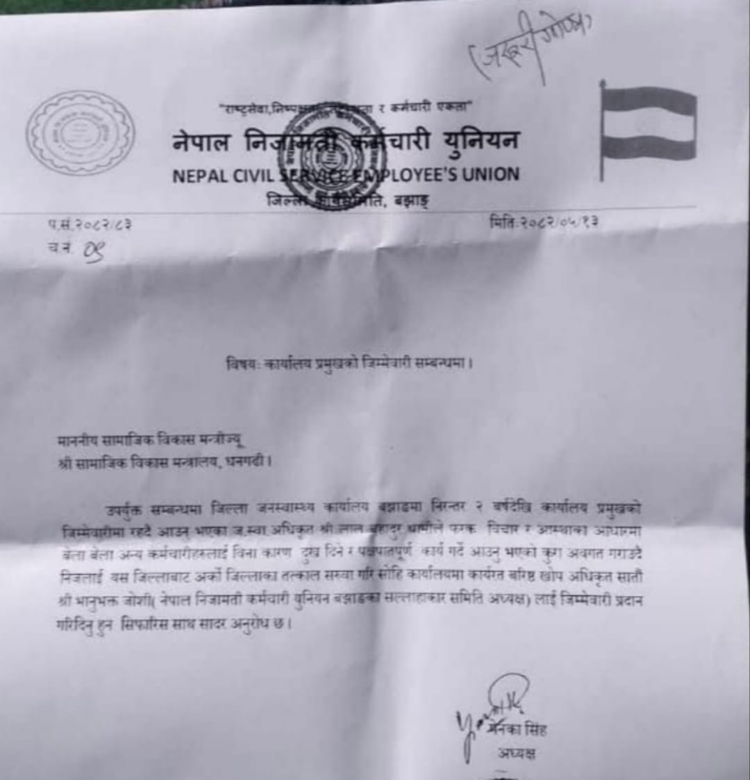 पत्रमा जोशीलाई “नेपाल निजामती कर्मचारी युनियन बझाङका सल्लाहकार समिति अध्यक्ष ” भनेर उल्लेख गरिएको छ।